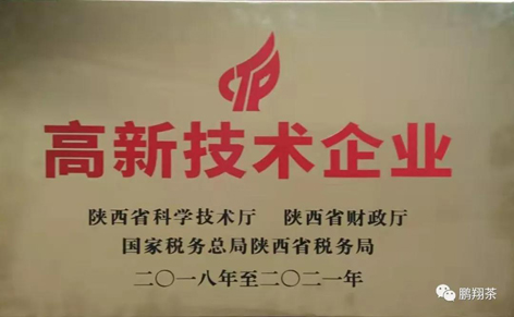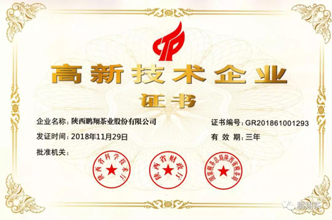 經陜西省高新技術企業(yè)認定管理工作領導小組辦公室組織專家評審,并報全國高新技術企業(yè)認定管理工作領導小組辦公室備案,認定鵬翔茶業(yè)為陜西省“高新技術企業(yè)”,并已獲得《高新技術企業(yè)》證書。