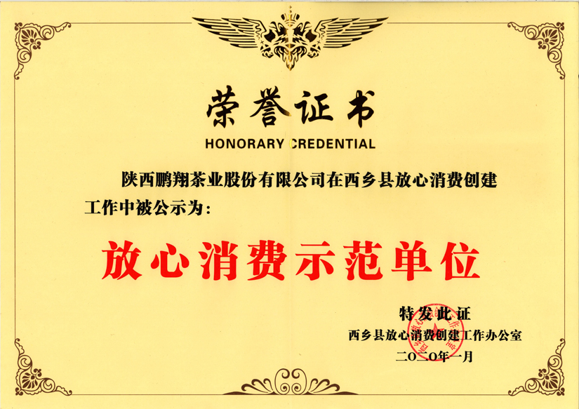鵬翔茶業(yè)被西鄉(xiāng)縣消費(fèi)者權(quán)益保護(hù)工作聯(lián)席會(huì)議辦公室暨放心消費(fèi)創(chuàng)建工作辦公室認(rèn)定為“放心消費(fèi)示范單位”。