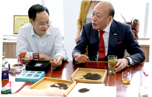 李金元董事長(右一)與鵬翔董事長探討漢中仙毫
