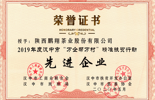 鵬翔茶業(yè)被漢中市工商聯(lián)、漢中市扶貧開發(fā)辦公室、漢中市民政局、漢中市慈善協(xié)會(huì)聯(lián)合授予2019年度漢中市“萬企幫萬村”精準(zhǔn)扶貧行動(dòng)先進(jìn)企業(yè)。