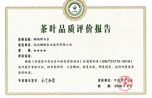 2020年全國茶葉品質(zhì)評價榜出爐!鵬翔白茶榮獲四星級