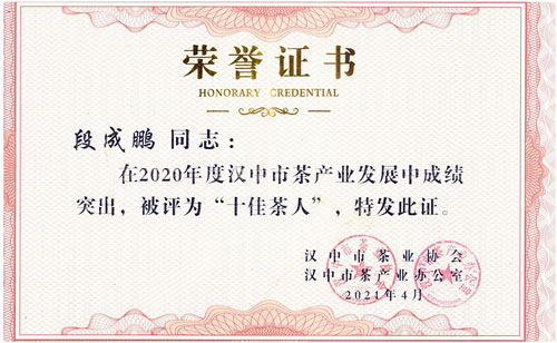 公司創(chuàng)始人段成鵬先生于2018年被中國國際茶文化研究會、廣東省茶文化研究會、陜西省茶文化研究會授予為中國產(chǎn)茶區(qū)域陜西茶區(qū)“十佳匠心茶人”;2019年被評為“第四屆省優(yōu)秀中國特色社會主義事業(yè)建設(shè)者”;2020年被陜西省總工會脫貧攻堅指揮部授予“陜西工會消費扶貧好物推薦官”、被省茶協(xié)聘請為茶葉審評專業(yè)委員會委員、被西北農(nóng)林科技大學(xué)聘請為園藝學(xué)院產(chǎn)業(yè)教師;2021年被漢中市茶業(yè)協(xié)會、漢中市茶產(chǎn)業(yè)辦公室評為十佳茶人。