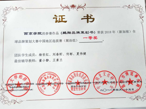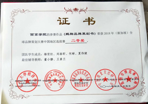 2018年4月22日-25日,鵬翔茶業(yè)品牌策劃室的西京學(xué)院代表團(tuán)隊(duì)參加2018年(新加坡)全球品牌策劃大賽中國地區(qū)選拔賽,其參賽作品《鵬翔品牌策劃書》在此次比賽中獲得二等獎(jiǎng)以及展洽組一等獎(jiǎng),在此次比賽中鵬翔茶業(yè)也被授予優(yōu)秀企業(yè)獎(jiǎng)。
